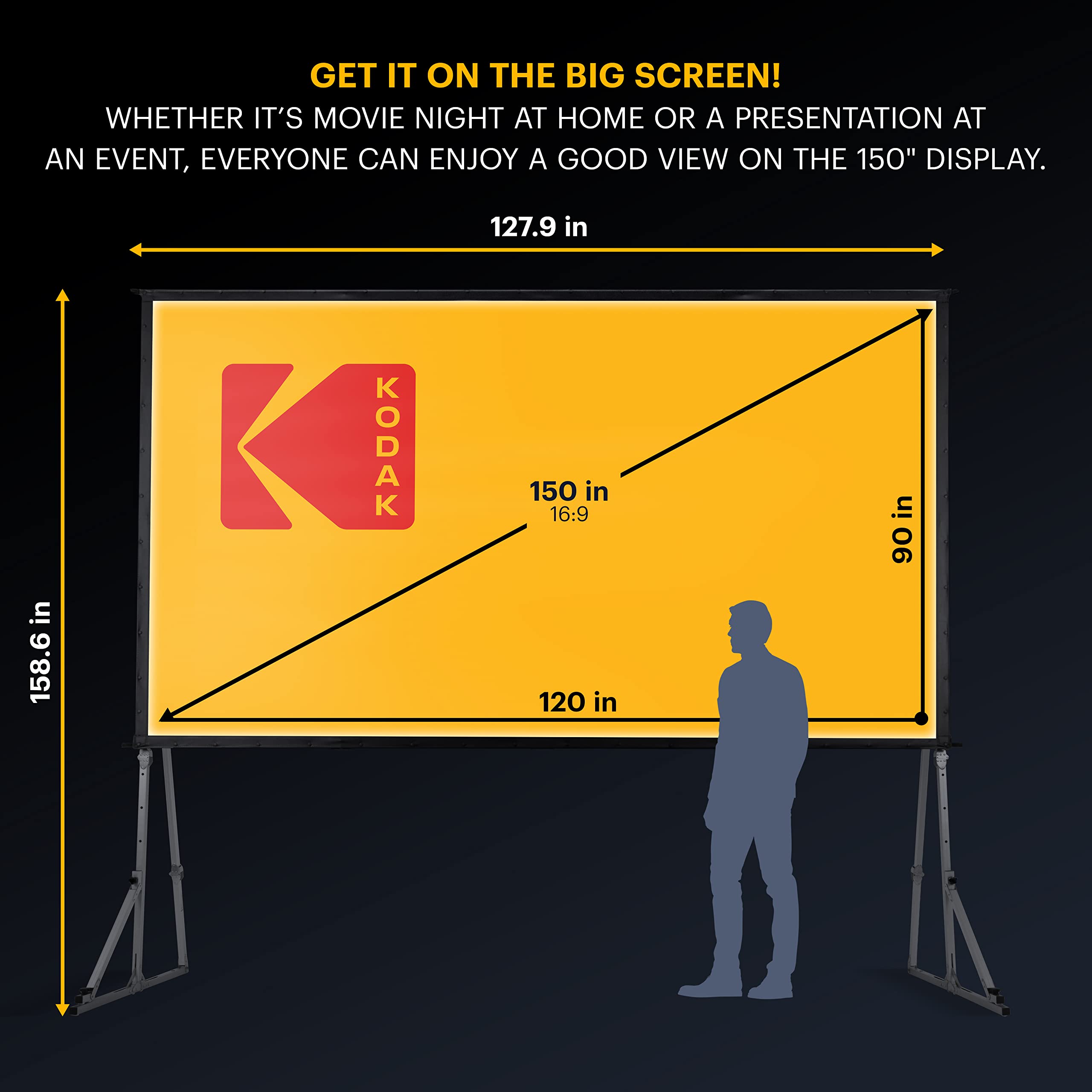 KODAK 150” Portable Projector Screen W/Stand - Fast Fold White Projection Backdrop for Outdoor & Indoor Movies with Tripod, Outdoor Stability Kit, & Black Storage Carry Case